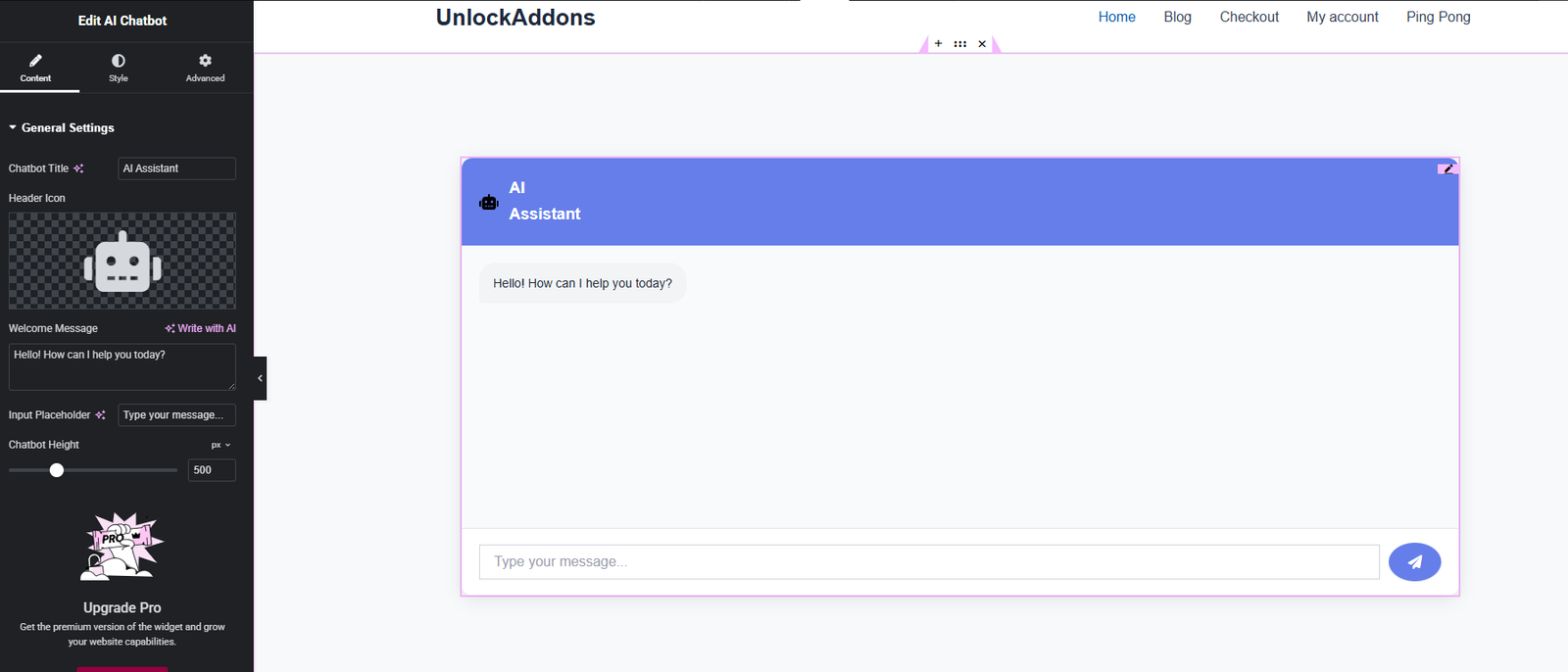 Drag and Drop the Unlock-Addons Chatbot widget to the Elementor Editing Panel.