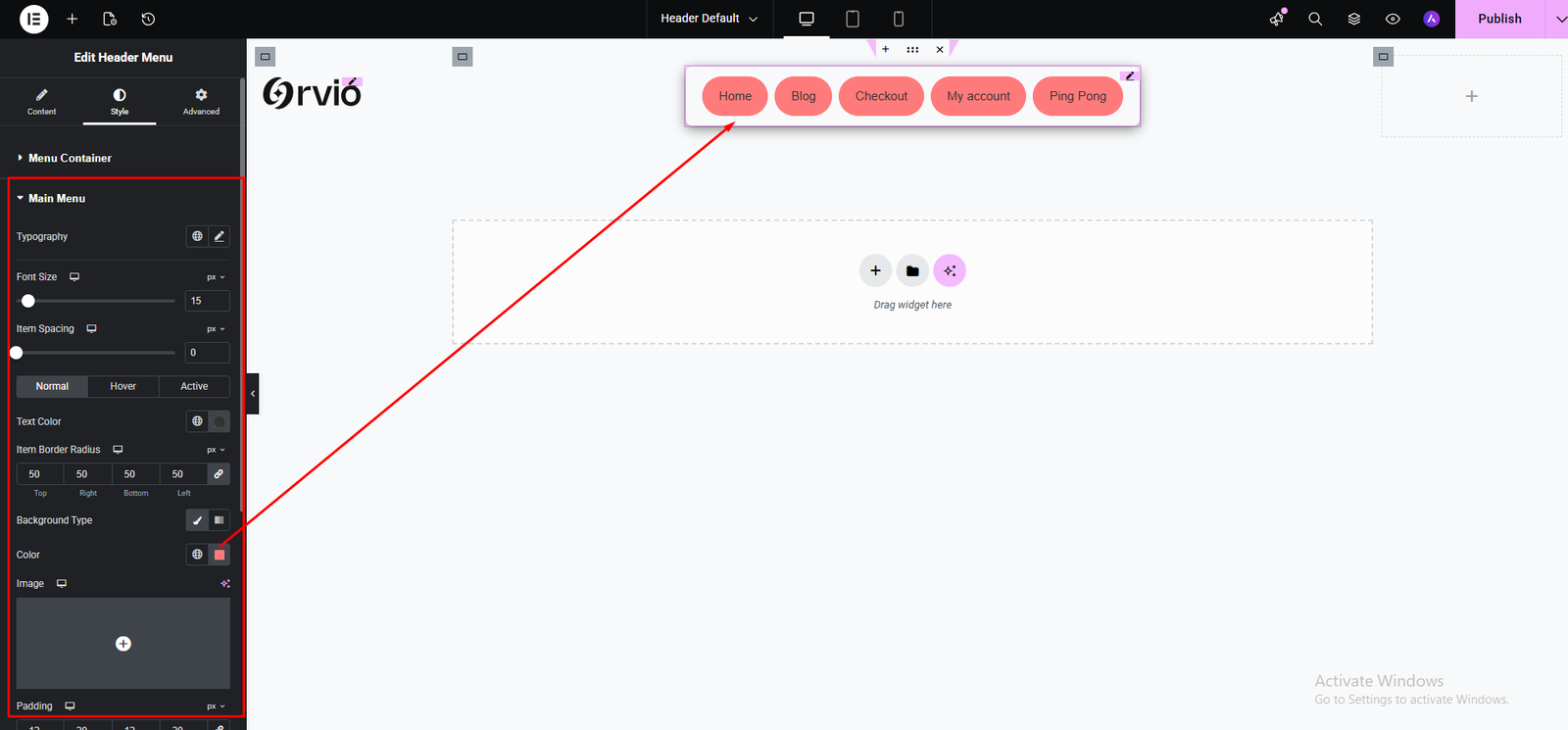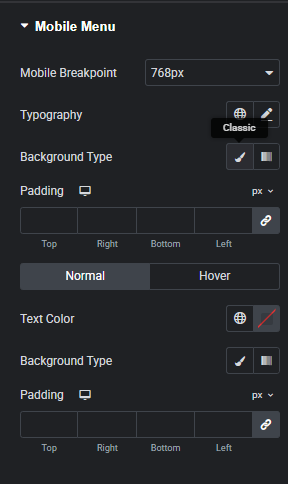 Main Menu typography, font-size, Color, padding, Item spacing and a lot of styling options here.