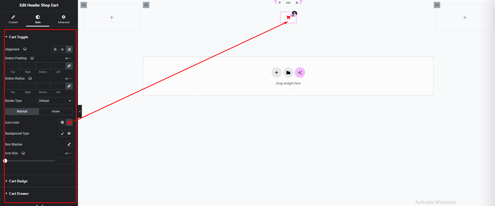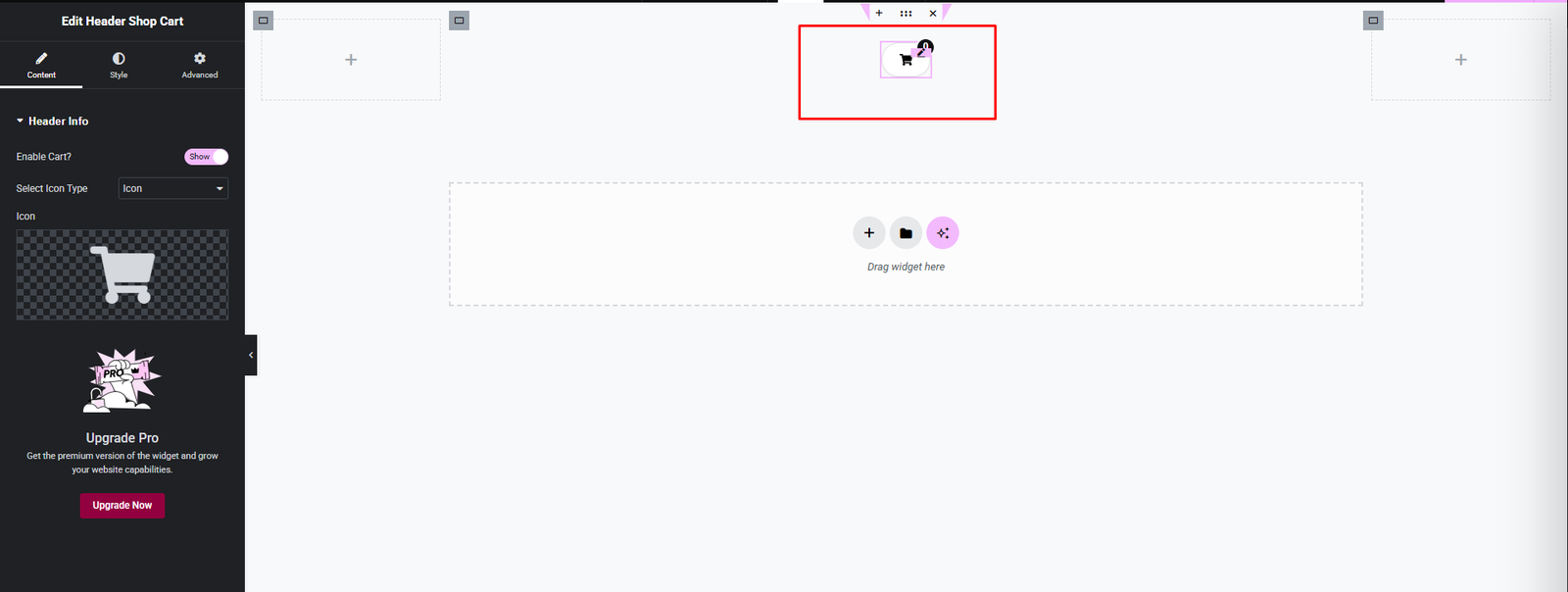 Drag and Drop the Unlock-Addons Header Shop Cart widget to the Elementor Editing Panel.