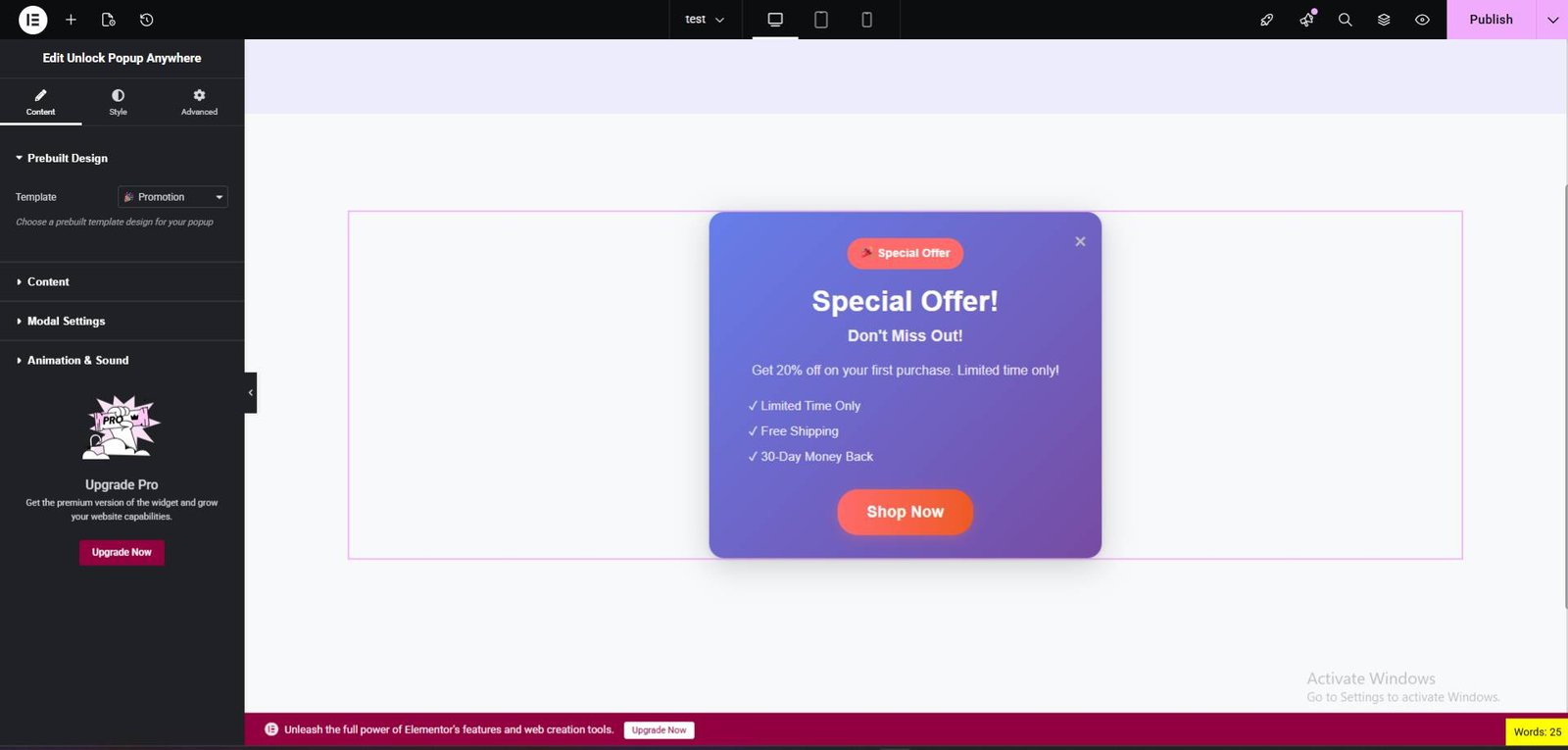 Design your popup content using the Elementor editor you already know — add forms, countdown timers, images, testimonials, or CTA buttons for promotions and lead capture.